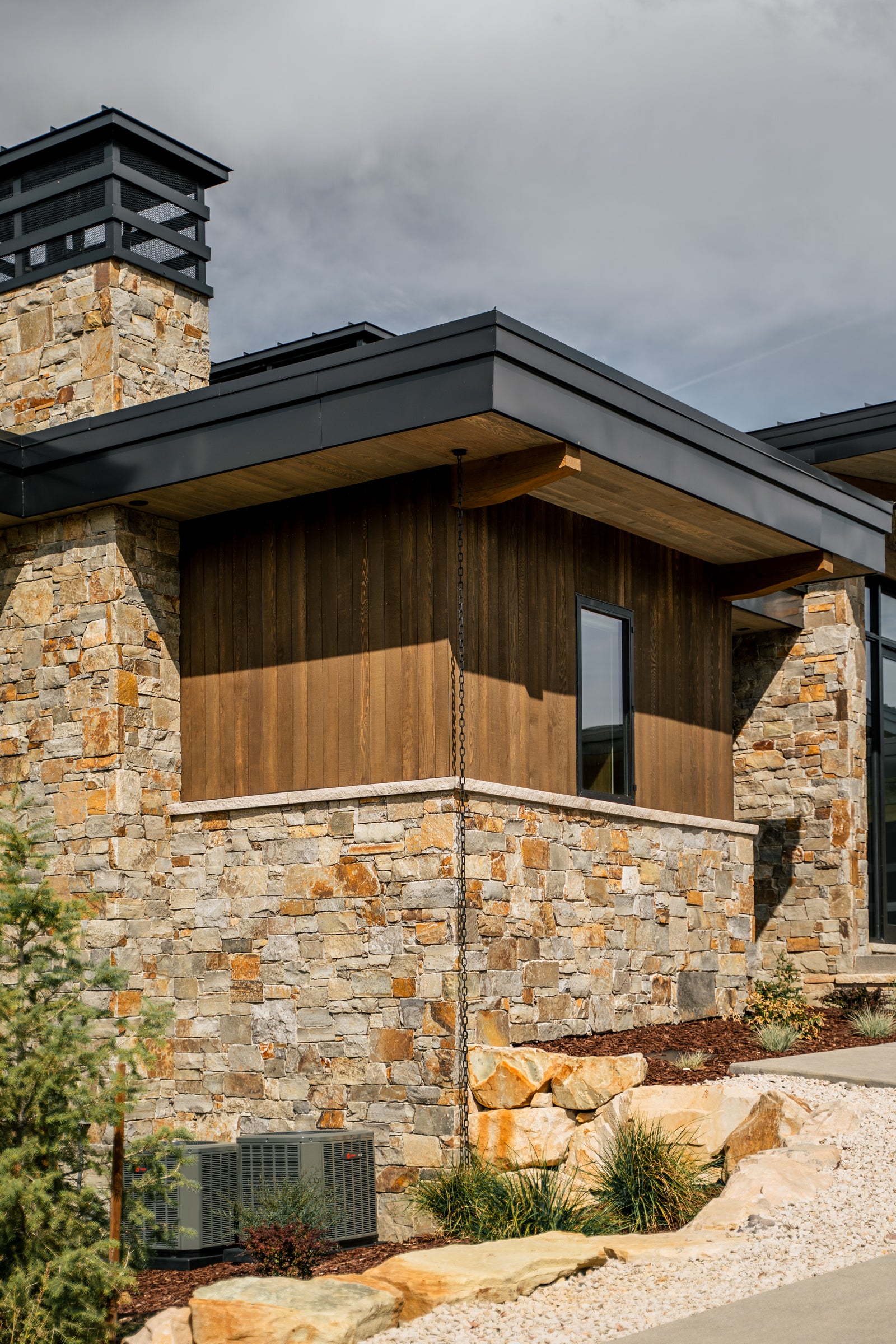 The priority the design and build team held on this project was maintaining ultra-clean lines for the fine line T&G siding. To do this, we chose clear mixed grain cedar for it's stability. The 1/8" lines have held true through all four seasons, proving the stability of kiln dried western red cedar.